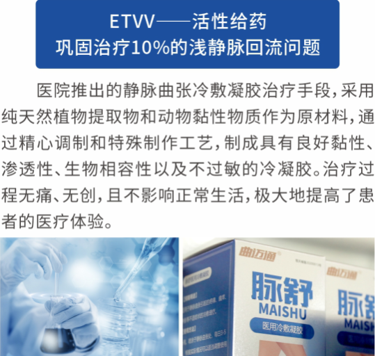 医院推出的静脉曲张冷敷凝胶治疗手段,采用纯天然植物提取物和动物黏性物质作为原材料,通过精心调制和特殊制作工艺,制成具有良好黏性、渗透性、生物相容性以及不过敏的冷凝胶。治疗过程无痛、无创,且不影响正常日常生活,极大地提高了患者的医疗体验。