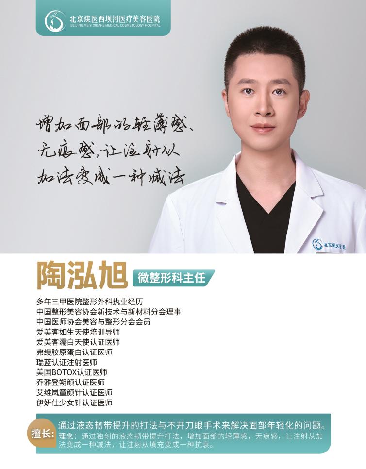 陶泓旭主任致力于为更多爱美人士提供安全、有效、个性化的微整形服务。如果你也渴望拥有明星般的幼态脸庞,不妨来到北京煤医微整科,让陶泓旭主任为你解锁青春的新密码。